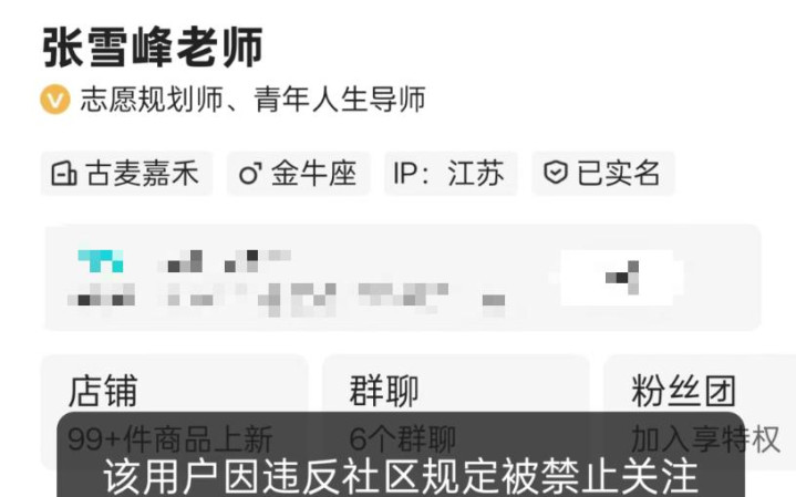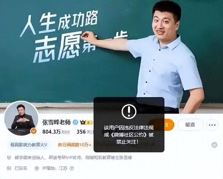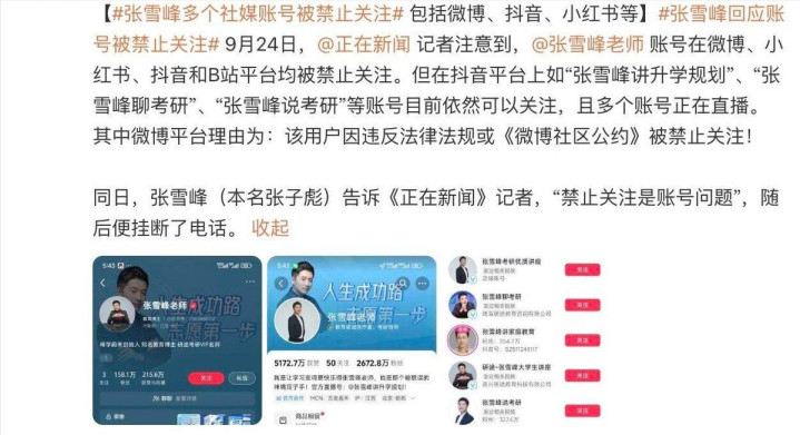 一夜之间,张雪峰在抖音、微博、小红书等平台上被禁止关注。